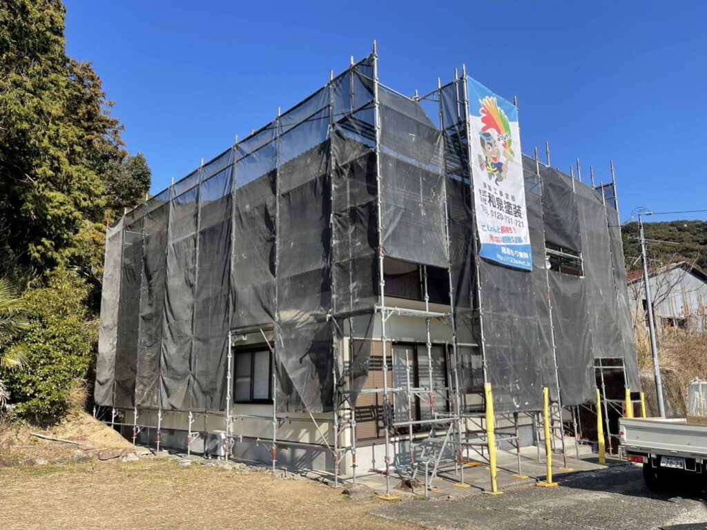 塗装工事では、足場の設置が必須となり、その際にメッシュシートを張るため